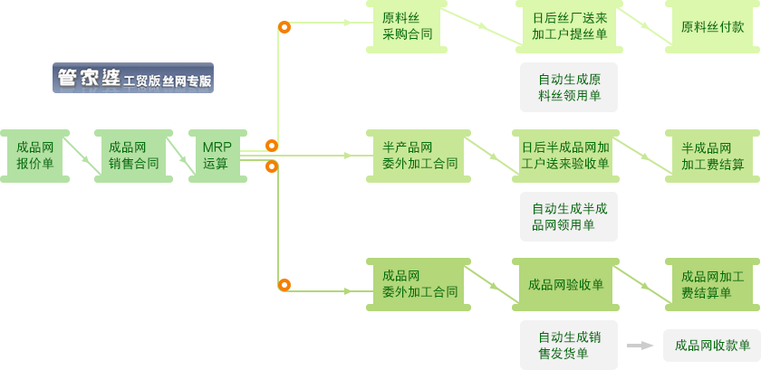 為了讓絲網(wǎng)行業(yè)更好的實(shí)現(xiàn)信息化管理,根據(jù)這些特點(diǎn),管家婆工貿(mào)版開(kāi)發(fā)了絲網(wǎng)專版,針對(duì)絲網(wǎng)行業(yè)進(jìn)行了不少的細(xì)節(jié)優(yōu)化,例如:進(jìn)貨自動(dòng)生成委外領(lǐng)料,完工自動(dòng)生成銷售等等,方便了用戶使用,準(zhǔn)確記錄了各個(gè)環(huán)節(jié)的數(shù)量,提高了工作效率和準(zhǔn)確率,受到了絲網(wǎng)生產(chǎn)廠家的歡迎。