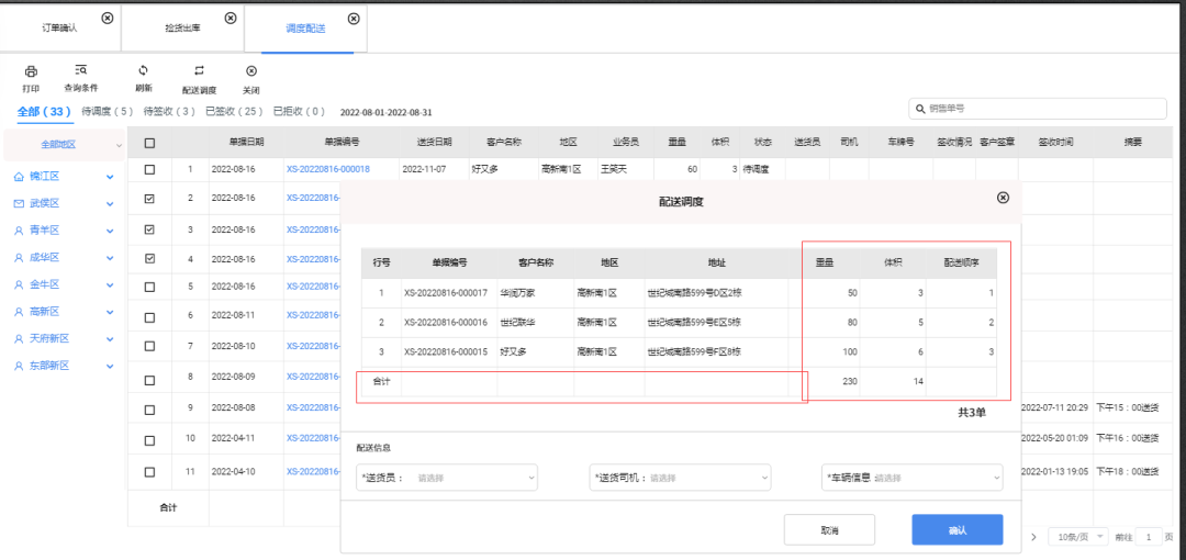 業務場景:倉管員揀貨裝箱后,可以根據路線(地區),訂單貨物多少合理規劃車輛裝載,配車發貨,出車相關登記。