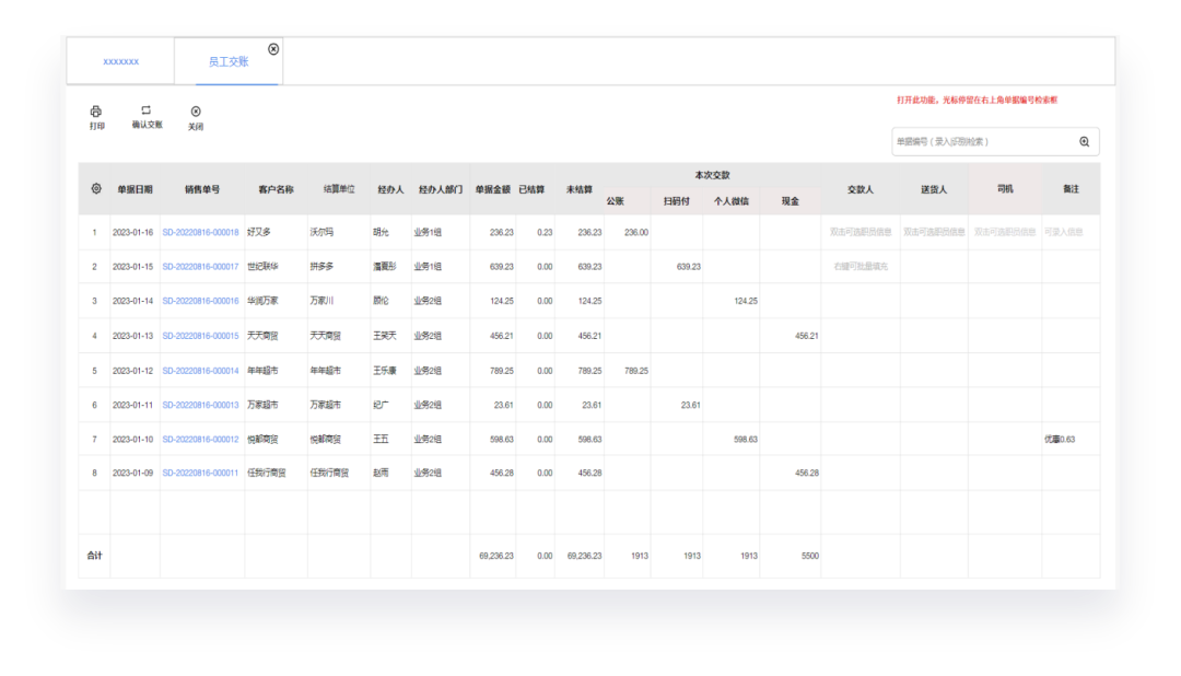 業務場景:司機帶上源單去配送,在客戶簽收時同時收取貨款,之后在帶回源單和貨款上交公司;業務員對歷史的欠單收取欠款、帶回貨款上交。